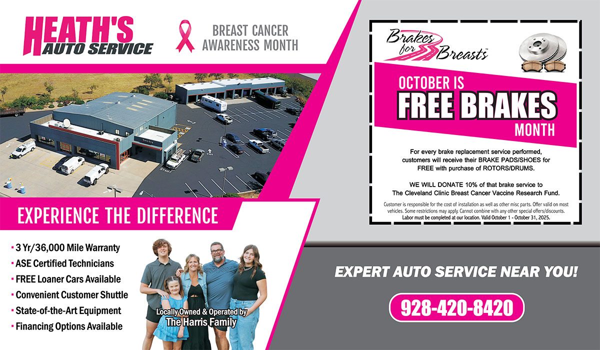 Here at Heath’s Auto Service, we believe in keeping all our customers safe and giving back to the community when we can. That is why for the month of October, we have partnered with Brakes for Breasts® and are offering FREE brake pads to every customer for the entire month. All you have to do is pay for the labor costs and anything else you might need. After your service is complete, our shop will donate 10% of those labor costs to Brakes for Breasts®, who will, in turn, donate 100% of that money to the Cleveland Breast Cancer Vaccine Fund. Yes, that 10% is from every brake repair that comes through our shop for the entire month of October. Do your part and aid in the fight against cancer, and get FREE brake pads while you’re at it. Give us a call to set your appointment for your FREE brake pads.